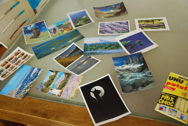 Entonces, cierto, todo eso influye sobre me… un poco… Pero no mantengo que pueda hacer lo mismo, yo soy bien pequeña… No juego en el mismo patio; ¡juego en mi living! Una pared blanca, un montón de postales con cuales ni sé que hacer después de las haber leido unas vecez y otras… Me encanta mandar postales cuando estoy viajando para sentirme un poco más cerca de la gente que extraño; me encanta recibir postales de mis seres queridos cuando estan viajando o solo mandando unas palabras desde su casa.