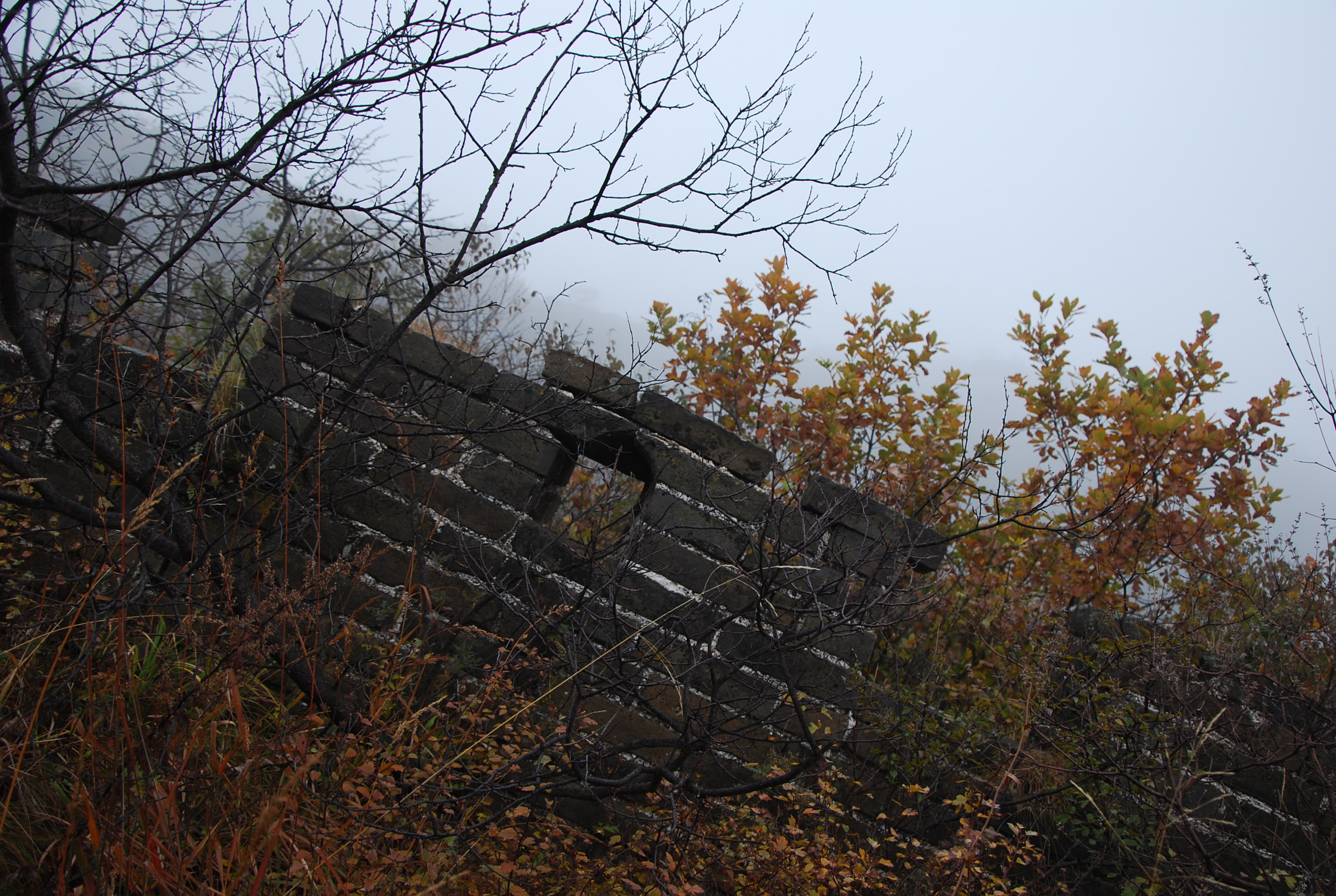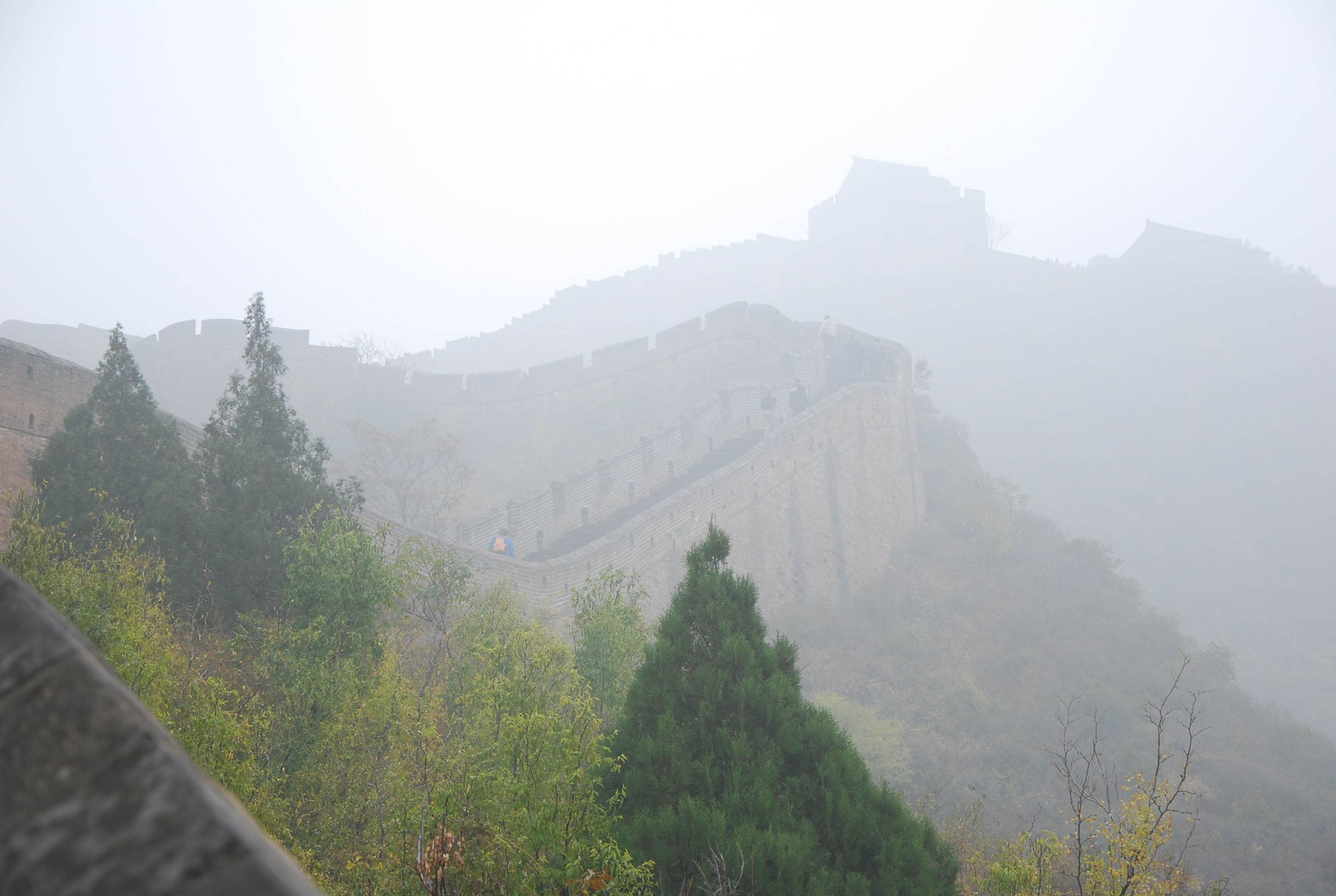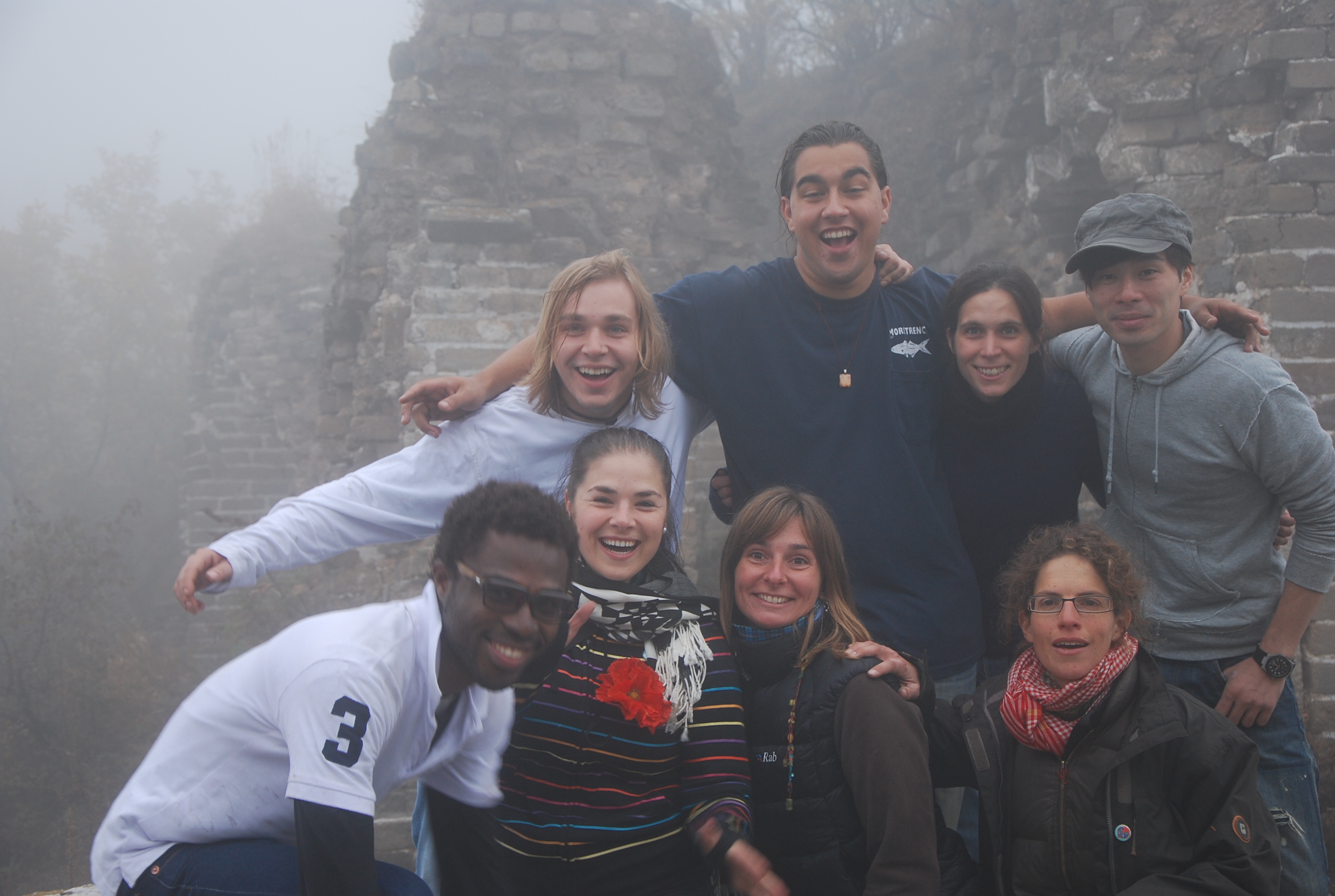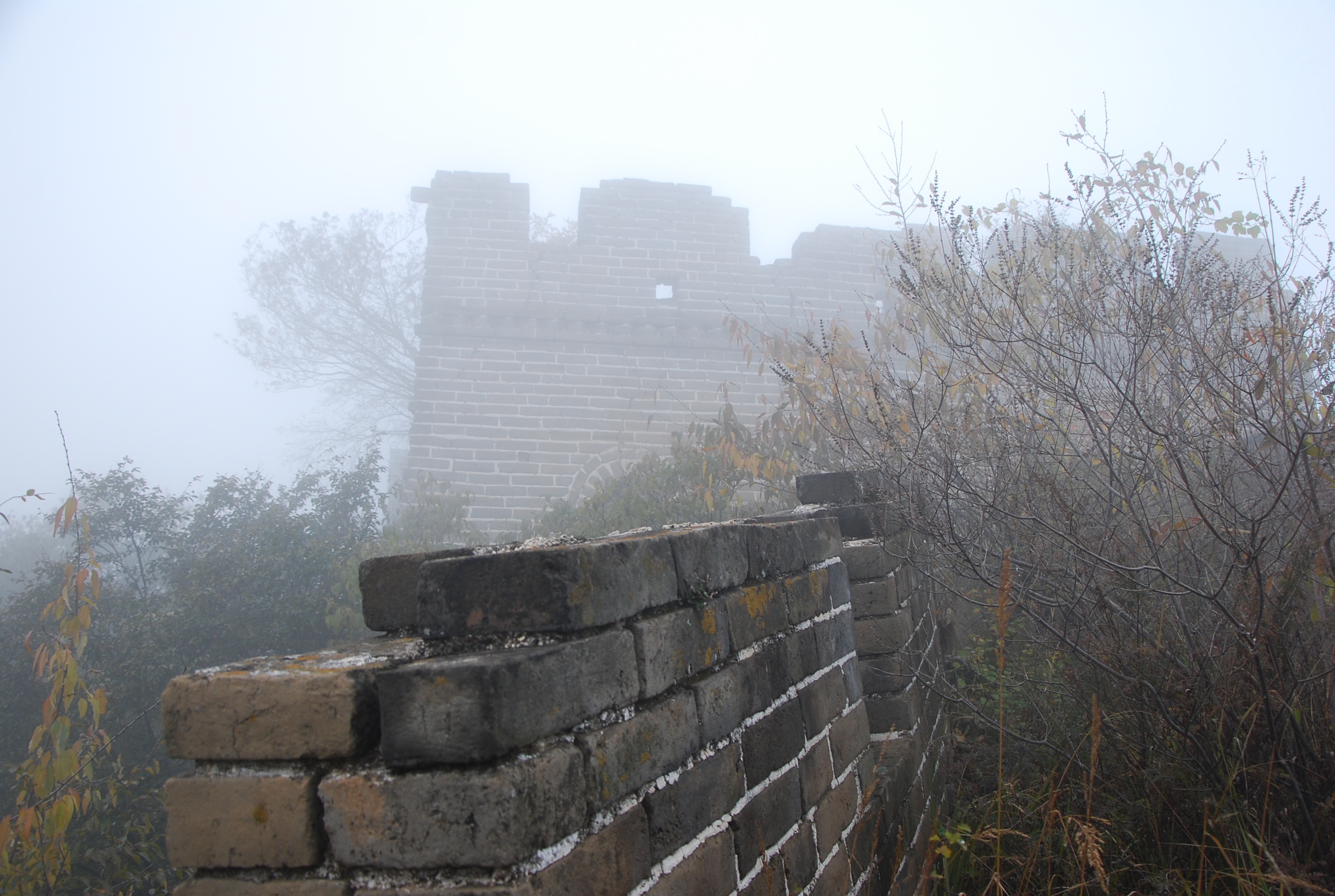 After a bus- and a minivan rides, without definite map or trail, with only a few explanations given by the leader of the group who had already come once, 16 of us headed out to find the wall in the mist. An idea that we had to give up on after 2 hours of fruitless search, even knowing that it couldn’t be far… Half of the group decided to go on whereas the other half decided to head out to the more easily found restaured section of Mutianyu, a few miles away. And then, oh surprise, we found the wall! It was right there, after the curve of the trail… But the mist is so thick, one really had to be a few feet away to see it!